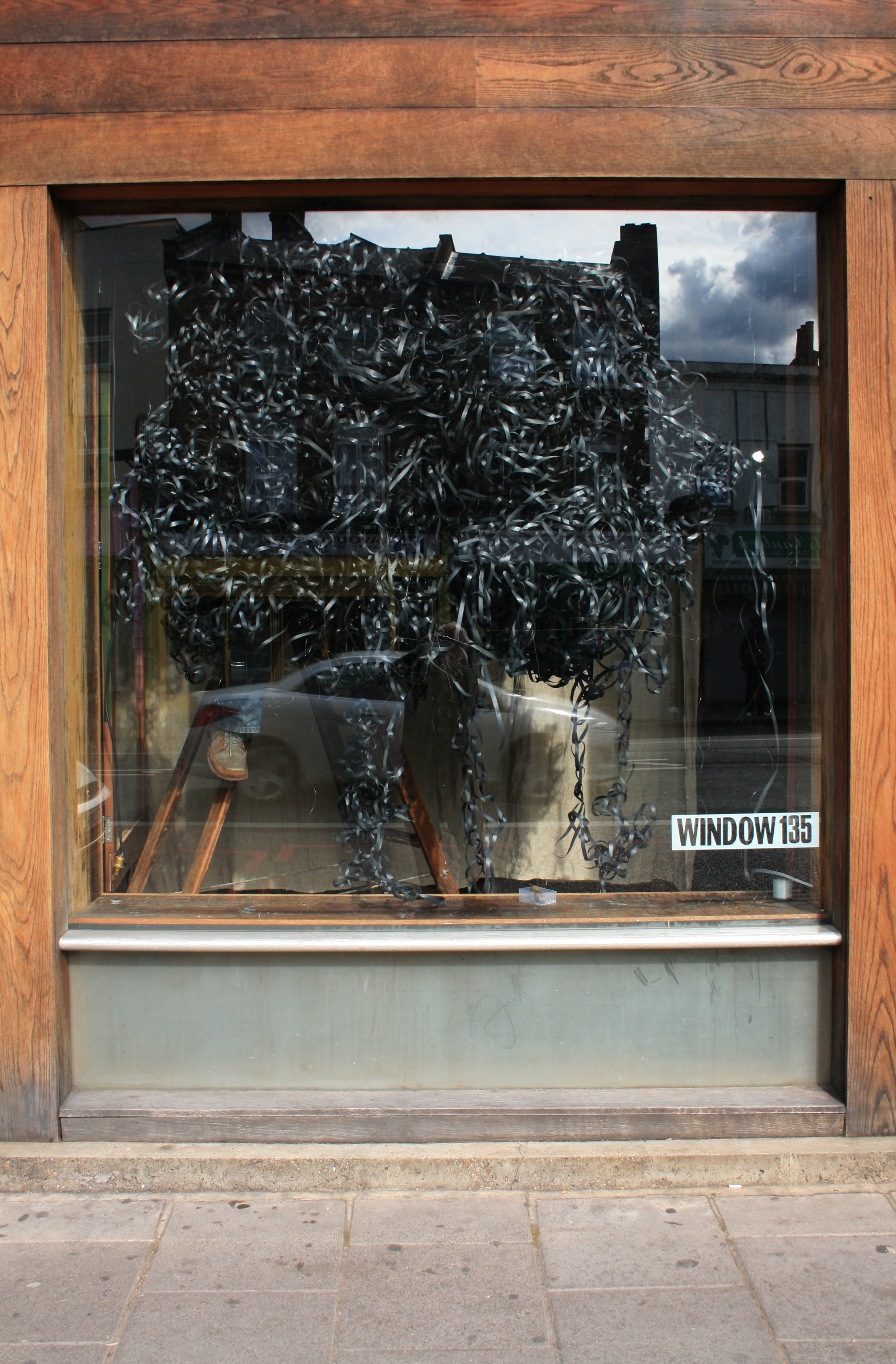 Andrew Ekins has transformed the WINDOW 135 space with a dense mass of loops, twists and coils of packaging tape woven together to form a fluid, continuous line; an over-stuffed-on-the-point-of-bursting drawing enfolded within the casement of the window. This work is the latest in a series of explorations of of drawing as a physical phenomenon, and is an extension of the project executed for the 2012 Folestone Triennial.