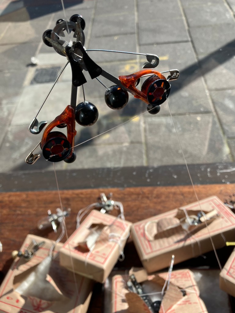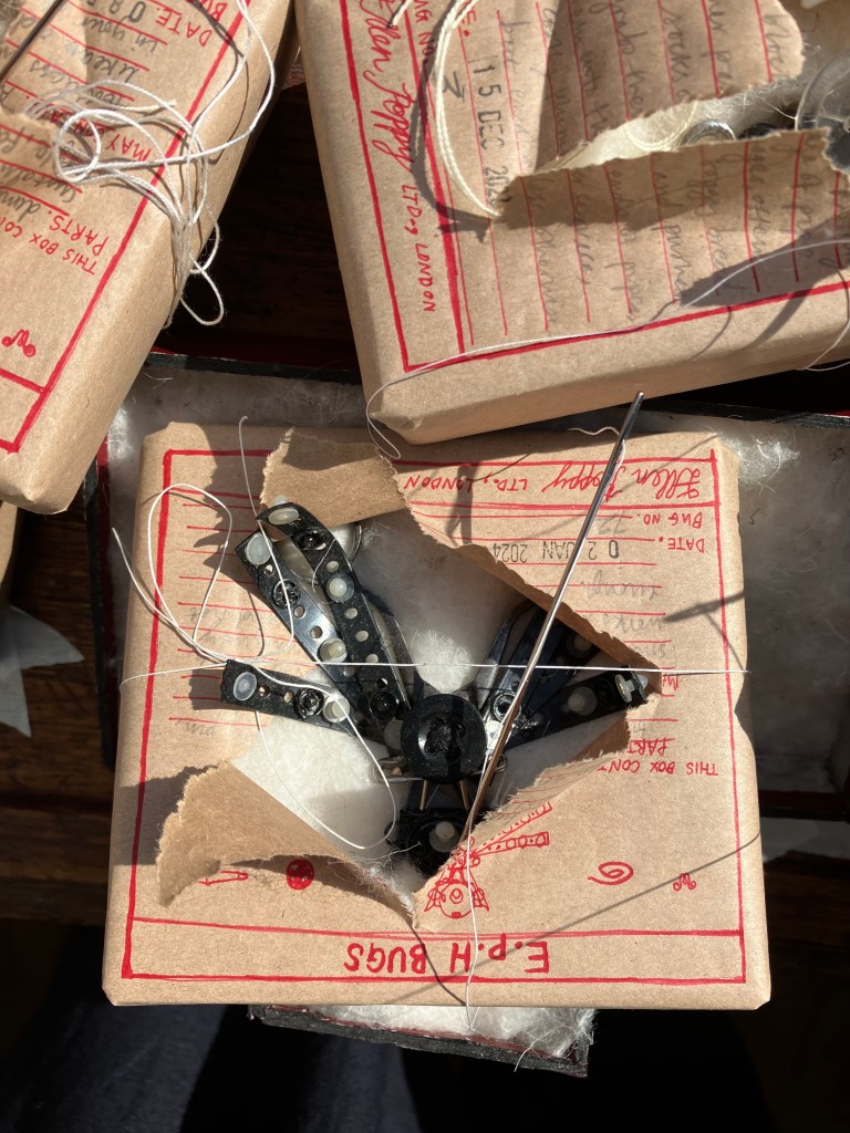 This box contains: Parts: mini safety pin, toggle, bead, wooden beads, plastic beads, thread, fabric buttons, needle. May cause: a stisfting tender touch, slight prick if approached without care, will occupy your bathroom sink.