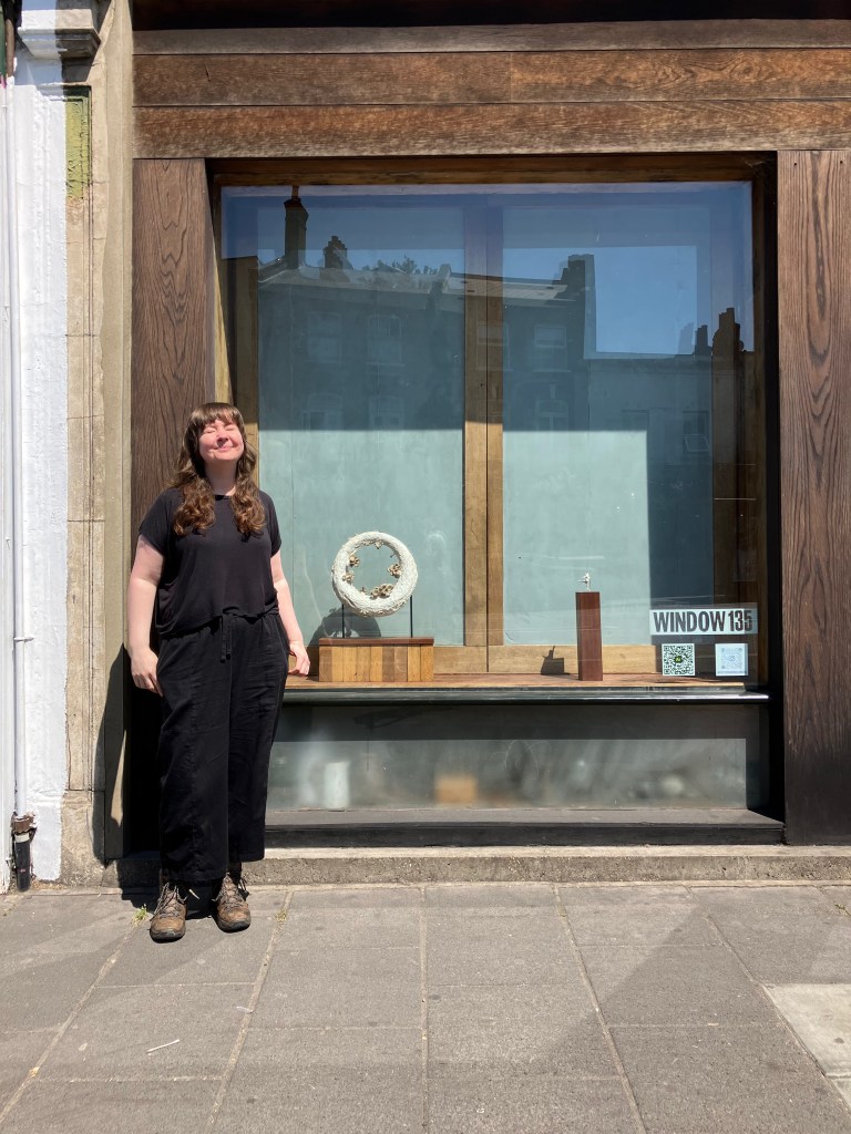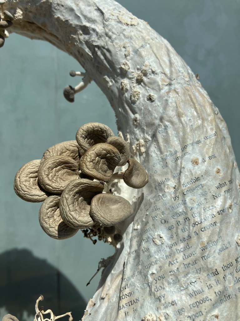 A living necklace, grown from mycelium and sprouting mushrooms links the past with the present. A silver ring cast from the artists form using photogrammetry and digital animation, becomes a relic of our time. A portal…a QR code…opens an augmented reality dreamscape where sound artist Eden Grey conjures up an aural underworld. Many thanks to @victoriakinglondon for the work.