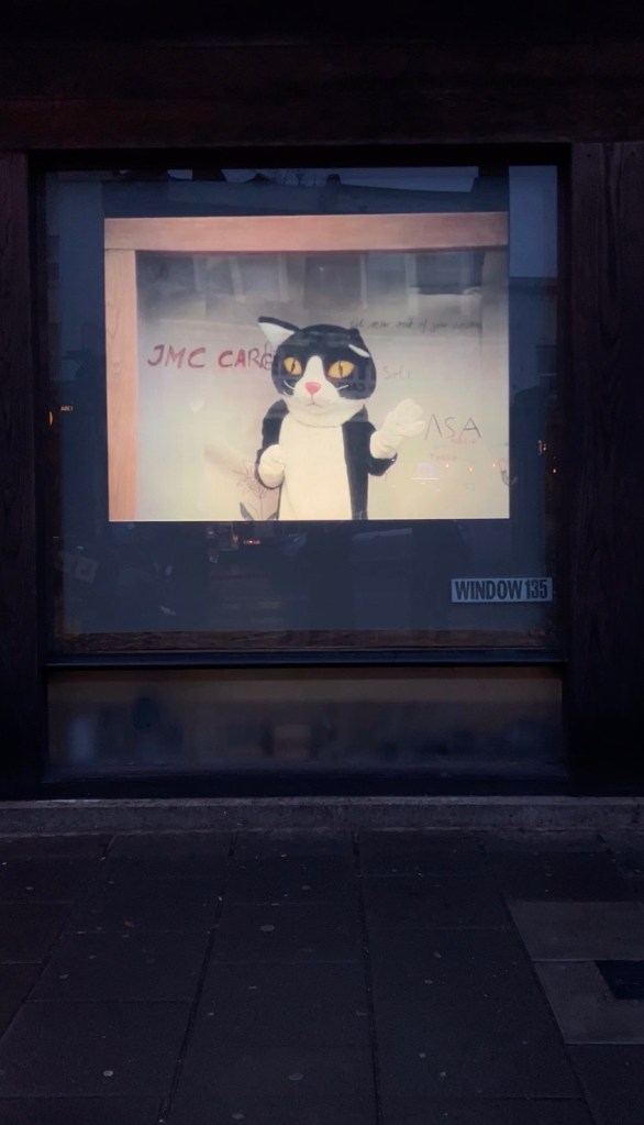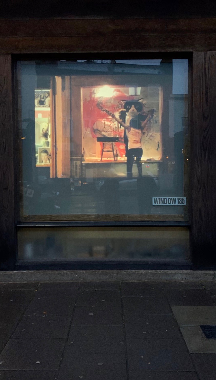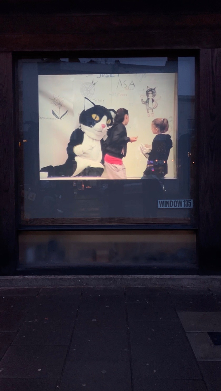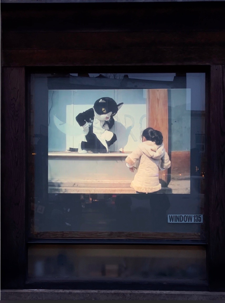 A cat in the window, a human in between.
