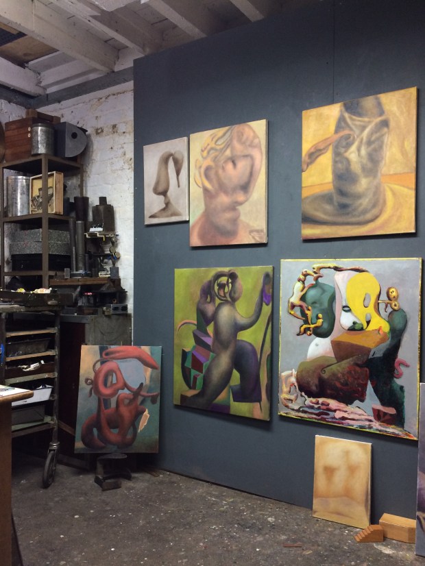 I think of something and draw it any old how. And then I keep going utterly abstractly until there’s a visual powerful logic. I ask Emma Biggs if something’s working and if she says no I keep changing it and I often have to rely entirely on her to pull something through. Sometimes I don’t even think of anything, I just draw an eye and it could be male or female.